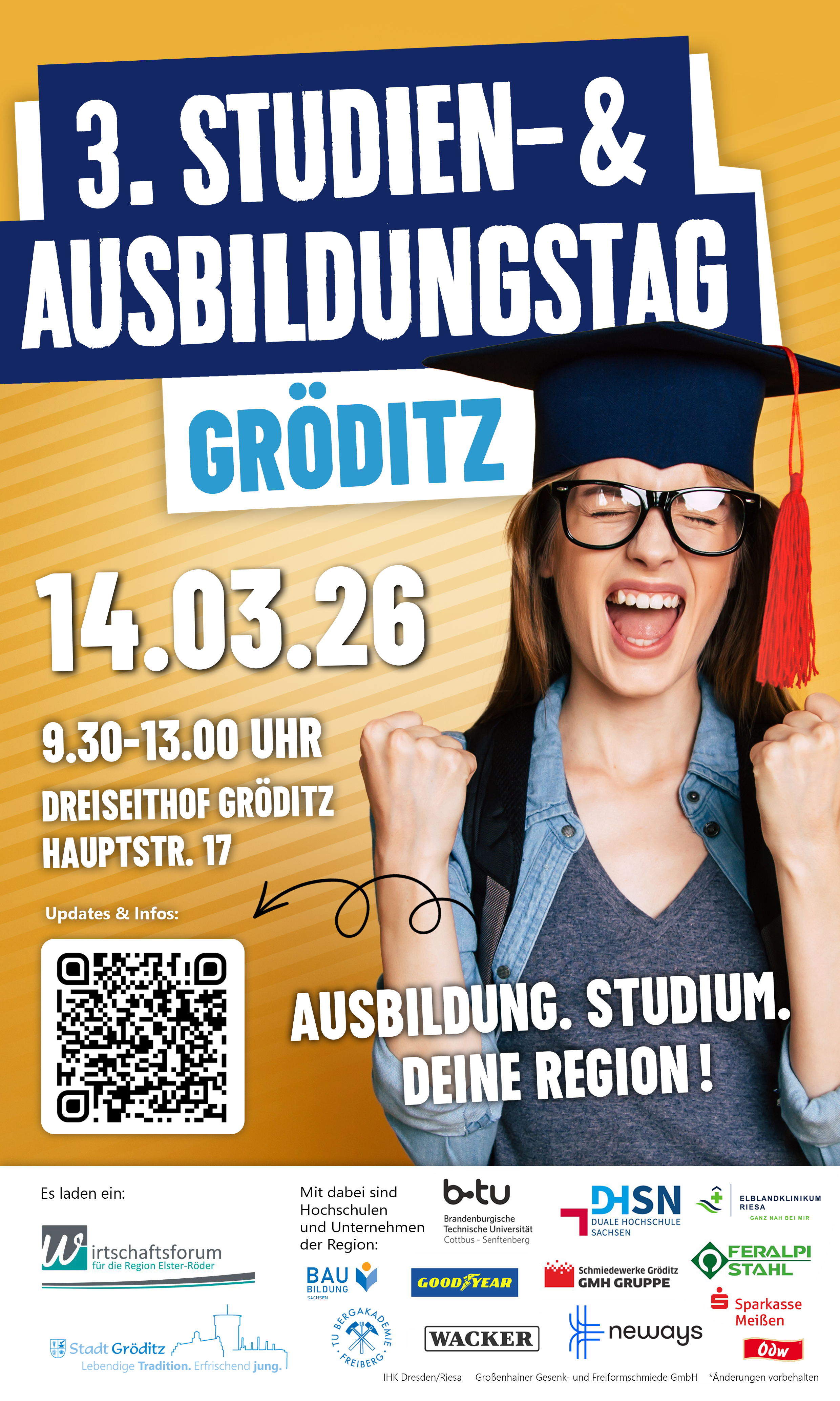 Präsentiert von der Stadt Gröditz und dem Wirtschaftsforum Elster-Röder stellen sich zahlreiche Hochschulen, Unternehmen und Institutionen aus der Region vor. An den Messeständen erhalten Besucherinnen und Besucher umfassende Informationen zu Ausbildungsberufen, Studiengängen, dualen Angeboten sowie weiteren beruflichen Perspektiven.