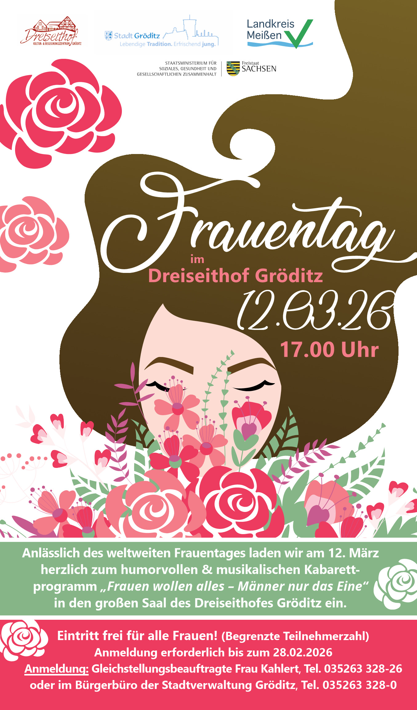 Anlässlich des weltweiten Frauentages laden wir am 12. März herzlich zum humorvollen & musikalischen Kabarettprogramm „Frauen wollen alles –Männer nur das Eine“ in den großen Saal des Dreiseithofes Gröditz ein. Eintritt frei für alle Frauen! (Begrenzte Teilnehmerzahl), Anmeldung erforderlich bis zum 28.02.2026, Anmeldung: Gleichstellungsbeauftragte Frau Kahlert, Tel. 035263 328-26 oder im Bürgerbüro der Stadtverwaltung Gröditz, Tel. 035263 328-0