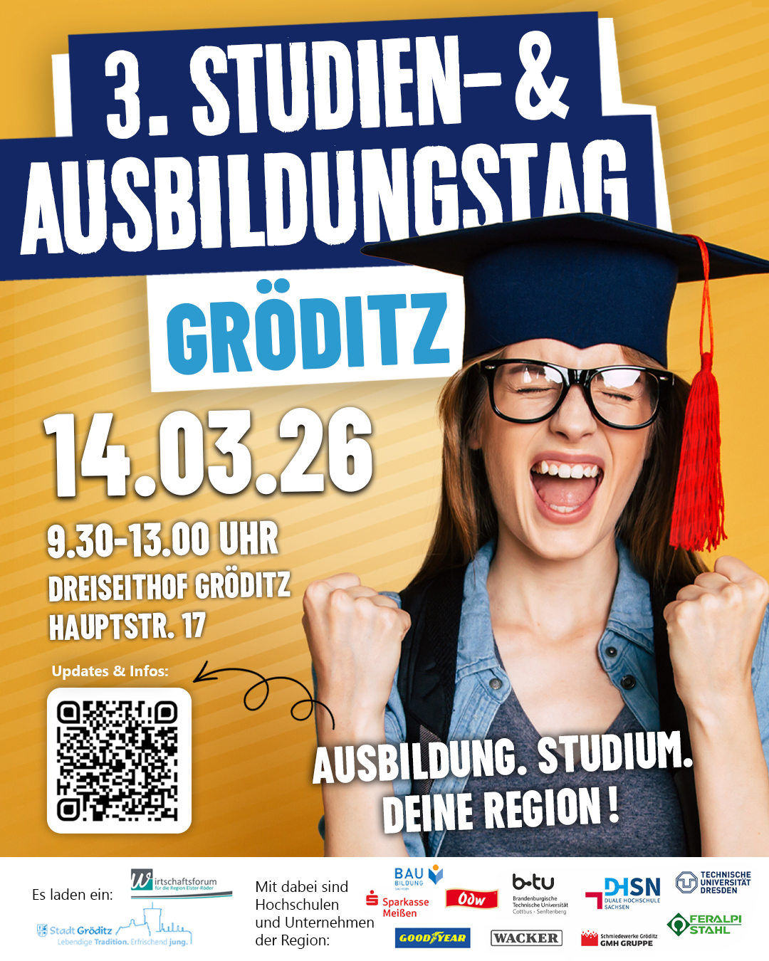 Wie geht es nach der Schule weiter? Welche Ausbildungs- oder Studienmöglichkeiten gibt es direkt vor Ort? Antworten auf diese Fragen bietet der 3. Studien- und Ausbildungstag am 14. März 2026 im Dreiseithof Gröditz. Präsentiert von der Stadt Gröditz und dem Wirtschaftsforum Elster Röder stellen sich zahlreiche Hochschulen, Unternehmen und Institutionen aus der Region vor. An den Messeständen erhältst du umfassende Infos zu: Ausbildungsberufen, Studiengängen, Dualen Angeboten und weiteren beruflichen Perspektiven. Alle aktuellen Infos findest du HIER.